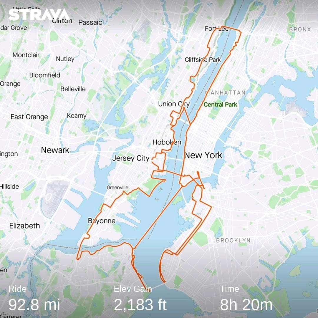 My longest ride to date was a 93mi day on the "Harbor Ring" ride (around New York harbor, except for the 2mi Verrazzano bridge between Brooklyn and Staten Island, which has 13 lanes for cars and biking/walking is prohibited):