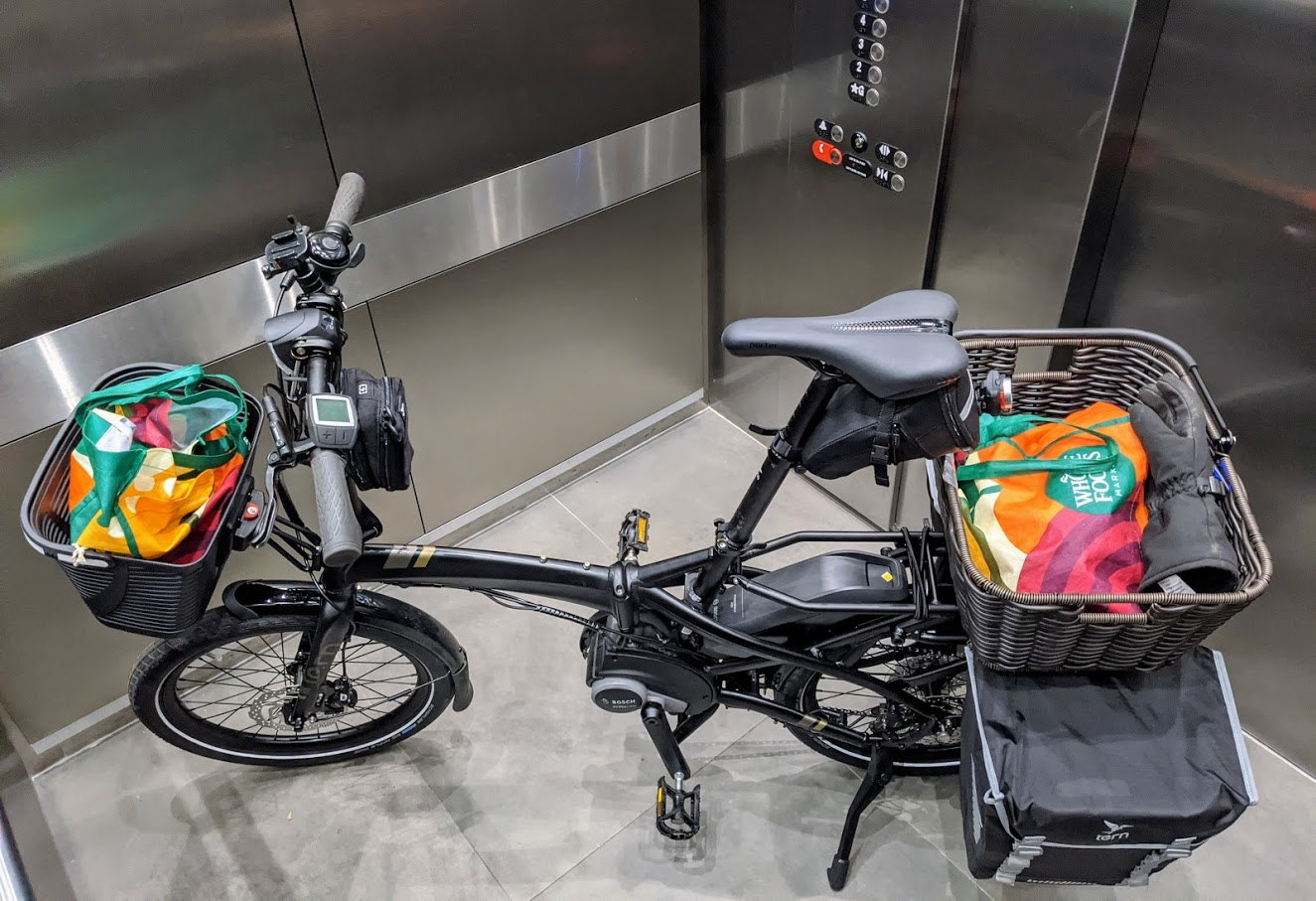 my VanMoof's front and rear racks let me roll 2 large panniers and a tote bag along with me