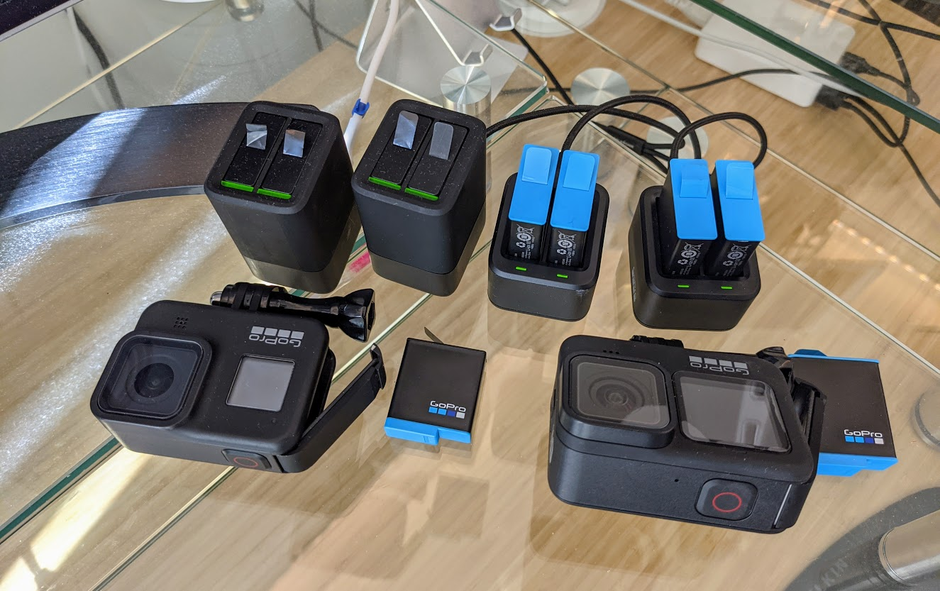 I have ended up with 5 batteries and 2 2-battery chargers for each of my GoPros (this 3x-USB-C cable is handy):