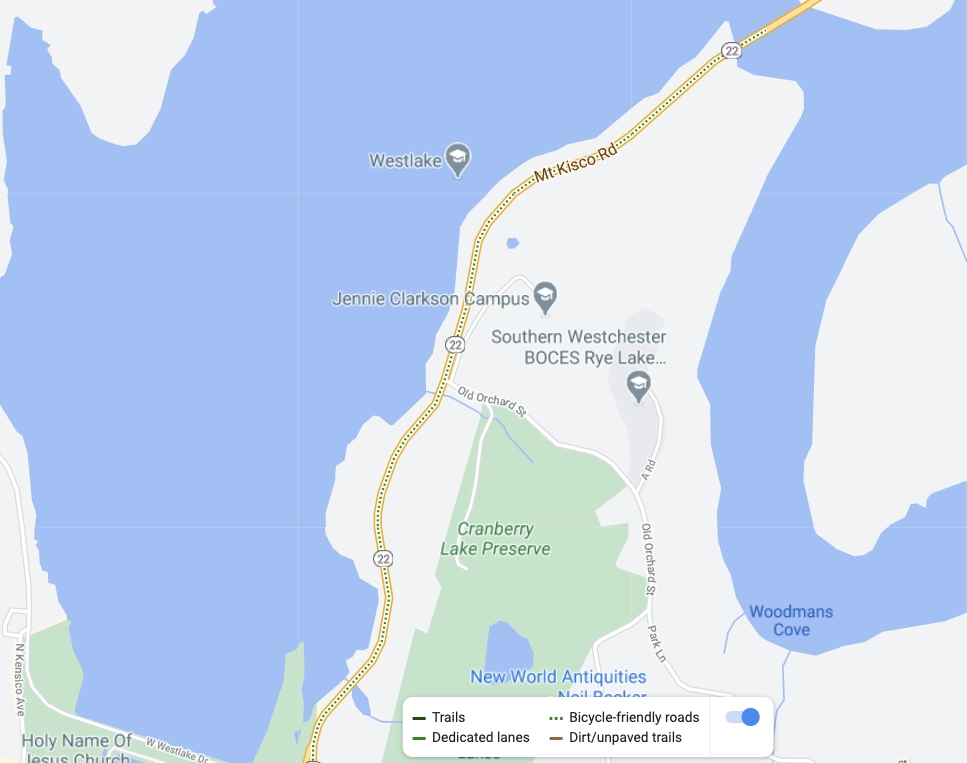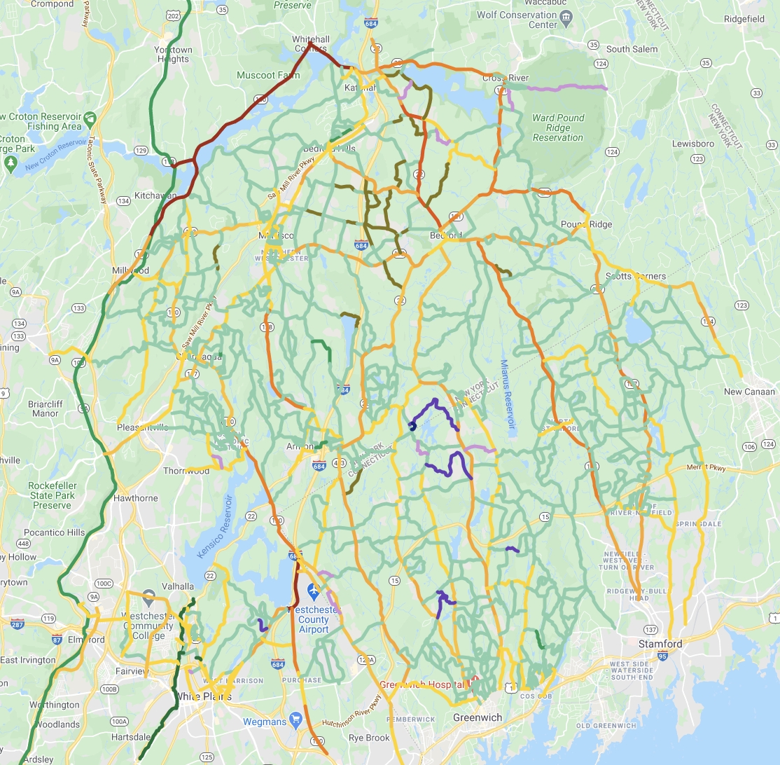 Inspired by the Chicago "mellow bike map", I made a "mellow bike Westchester" Google map while staying up there for a few weeks and trying to plan rides (for myself and others less experienced, where it was extra important not to accidentally end up on no-shoulder 45mph roads):