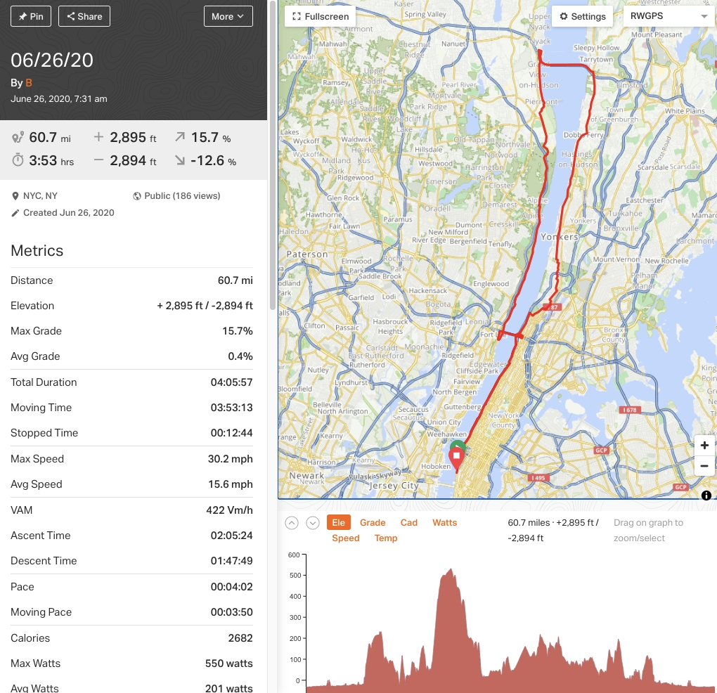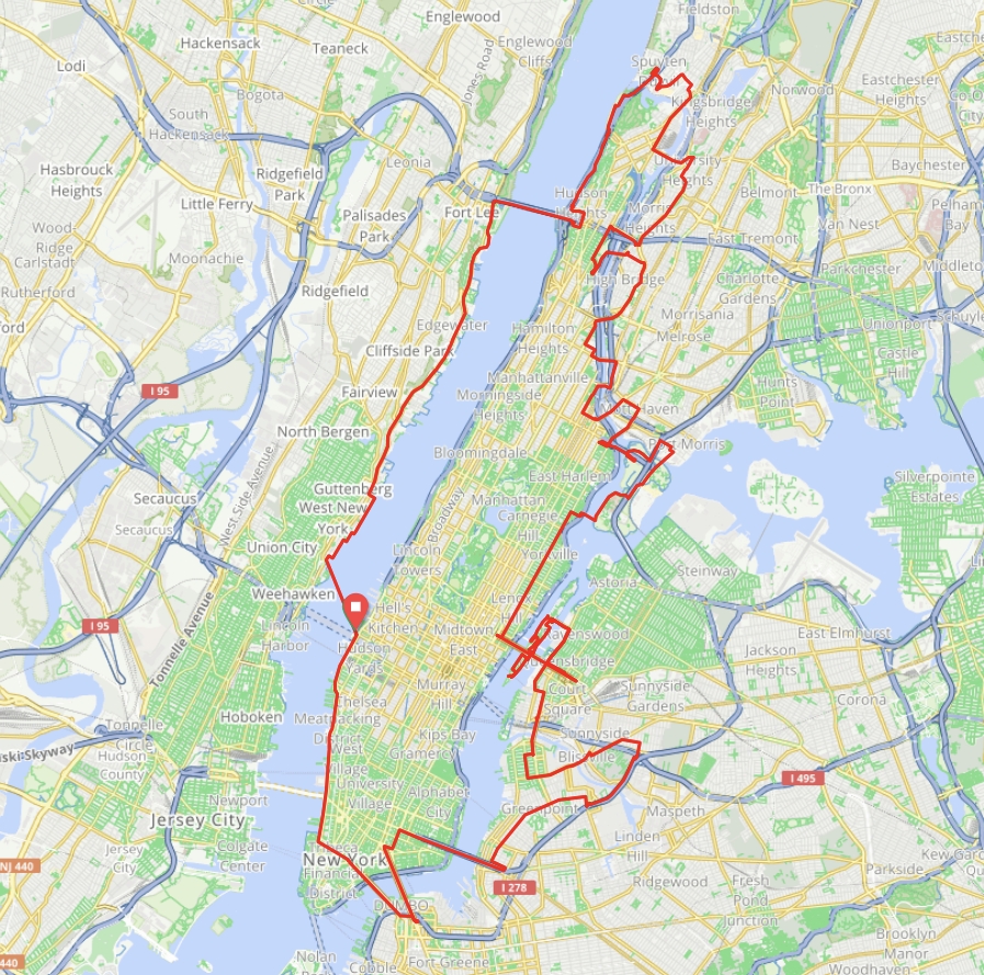 For example, here's someone's route up Manhattan's West Side Highway and looping between the George Washington and Tappan Zee bridges: